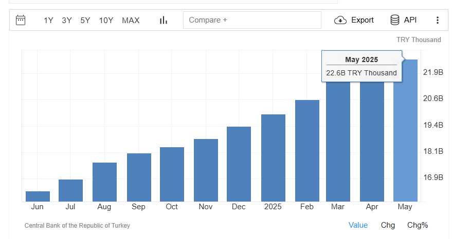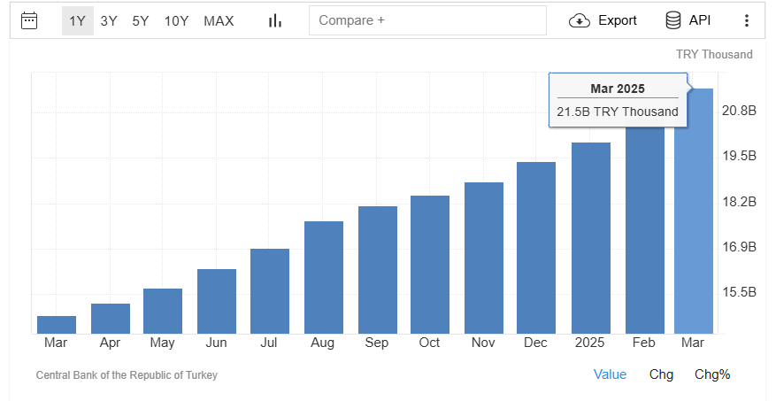 Türkiye’de Mart 2025 itibarıyla M3 para arzı 21,5 trilyon TL’ye ulaştı.